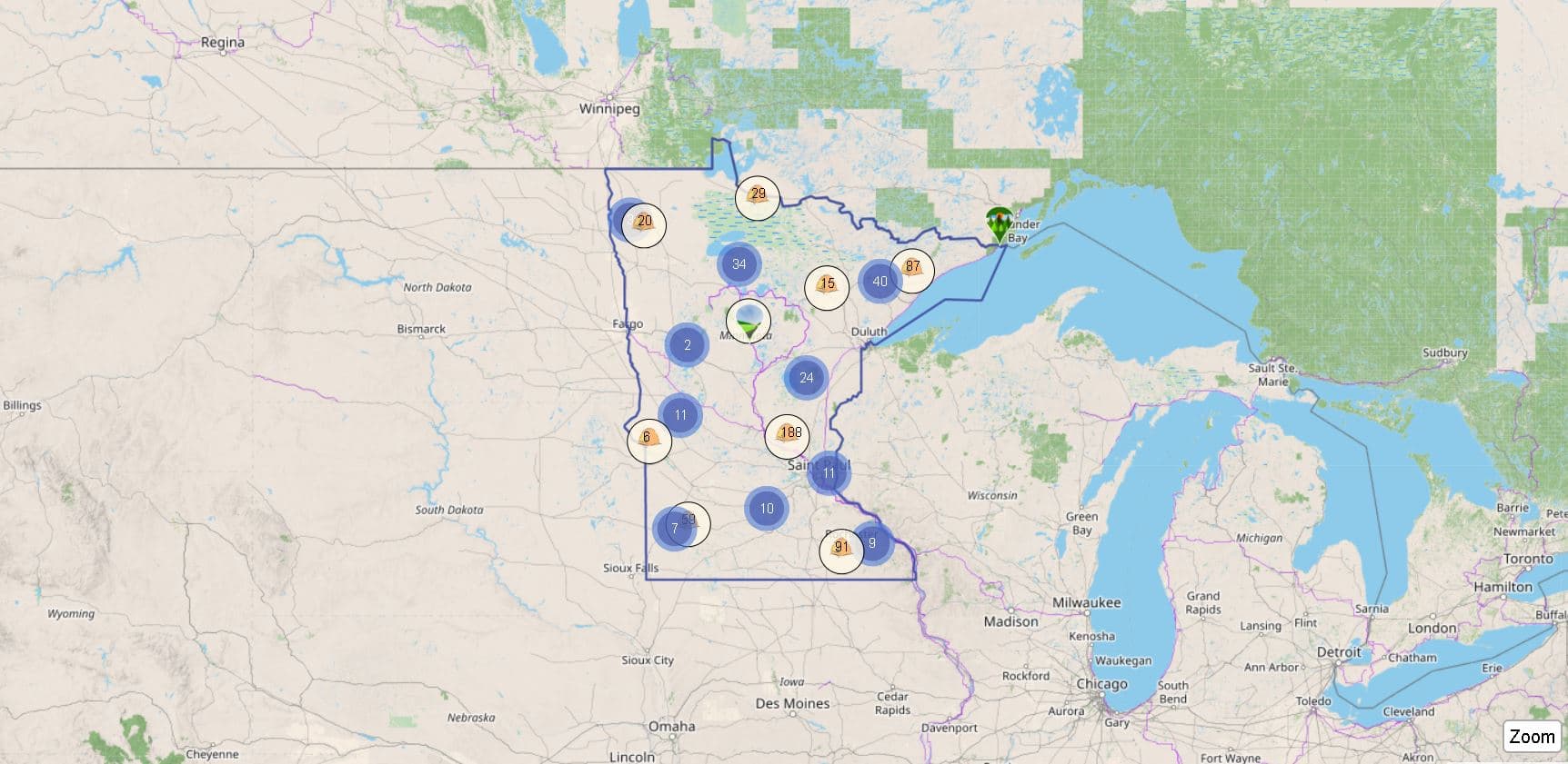 An interactive map that displays Minnesota Campgrounds and State Lands.